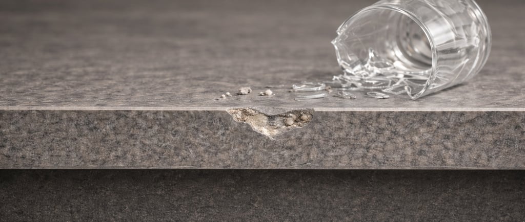 V takom prípade môže dôjsť k odštiepeniu hrany alebo rohu, podobne ako pri prírodnom kameni. Nejde o bežné opotrebenie, ale o mechanický náraz veľkej sily na malé miesto.